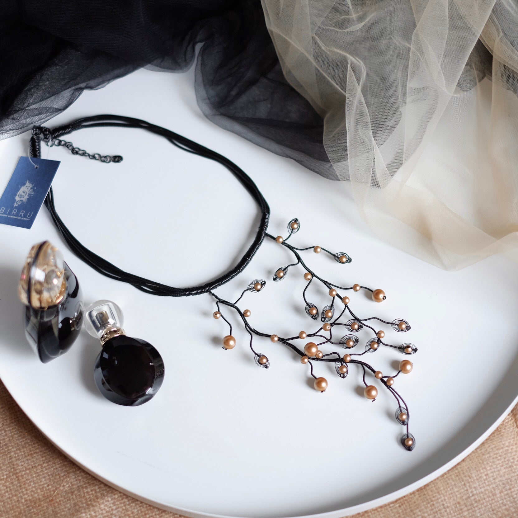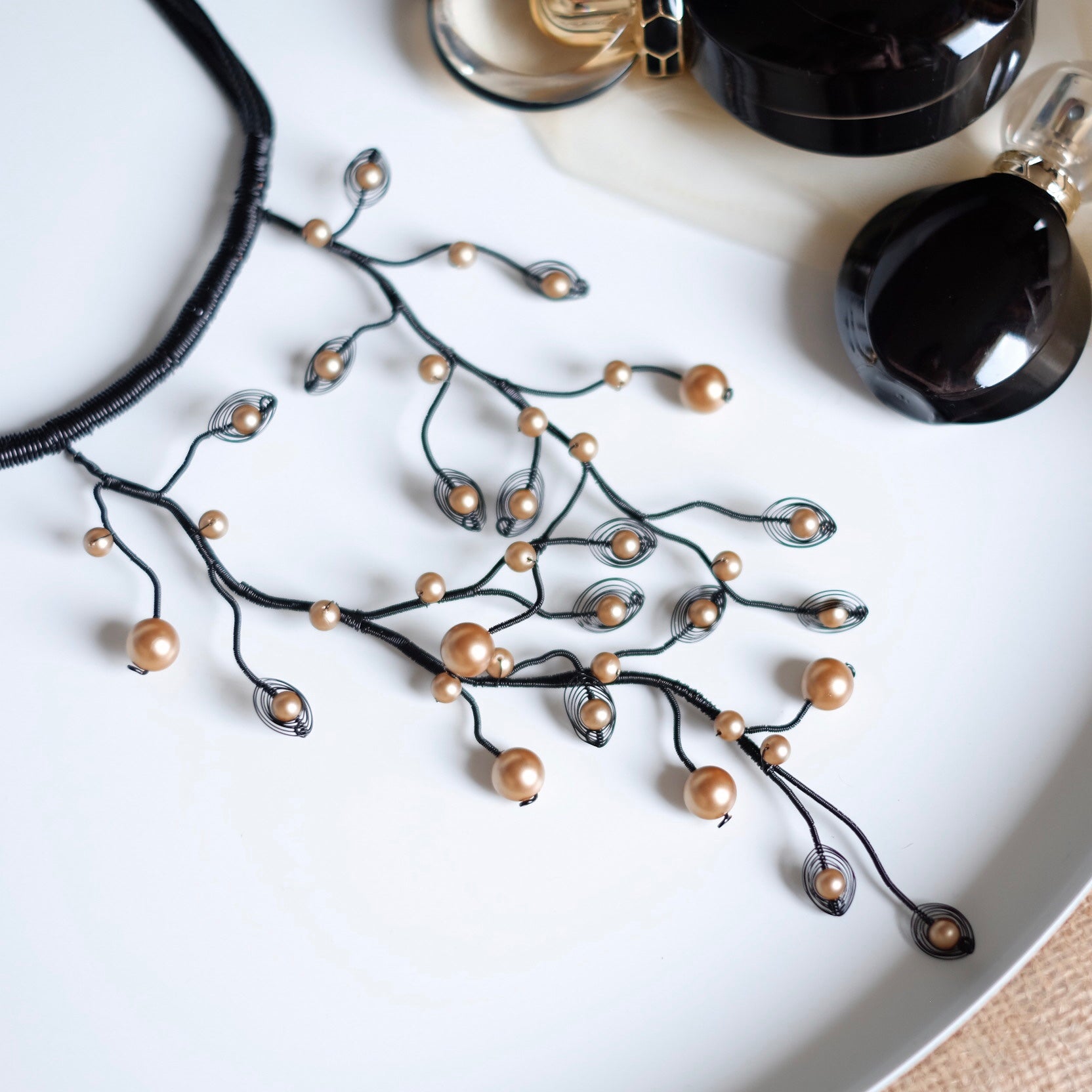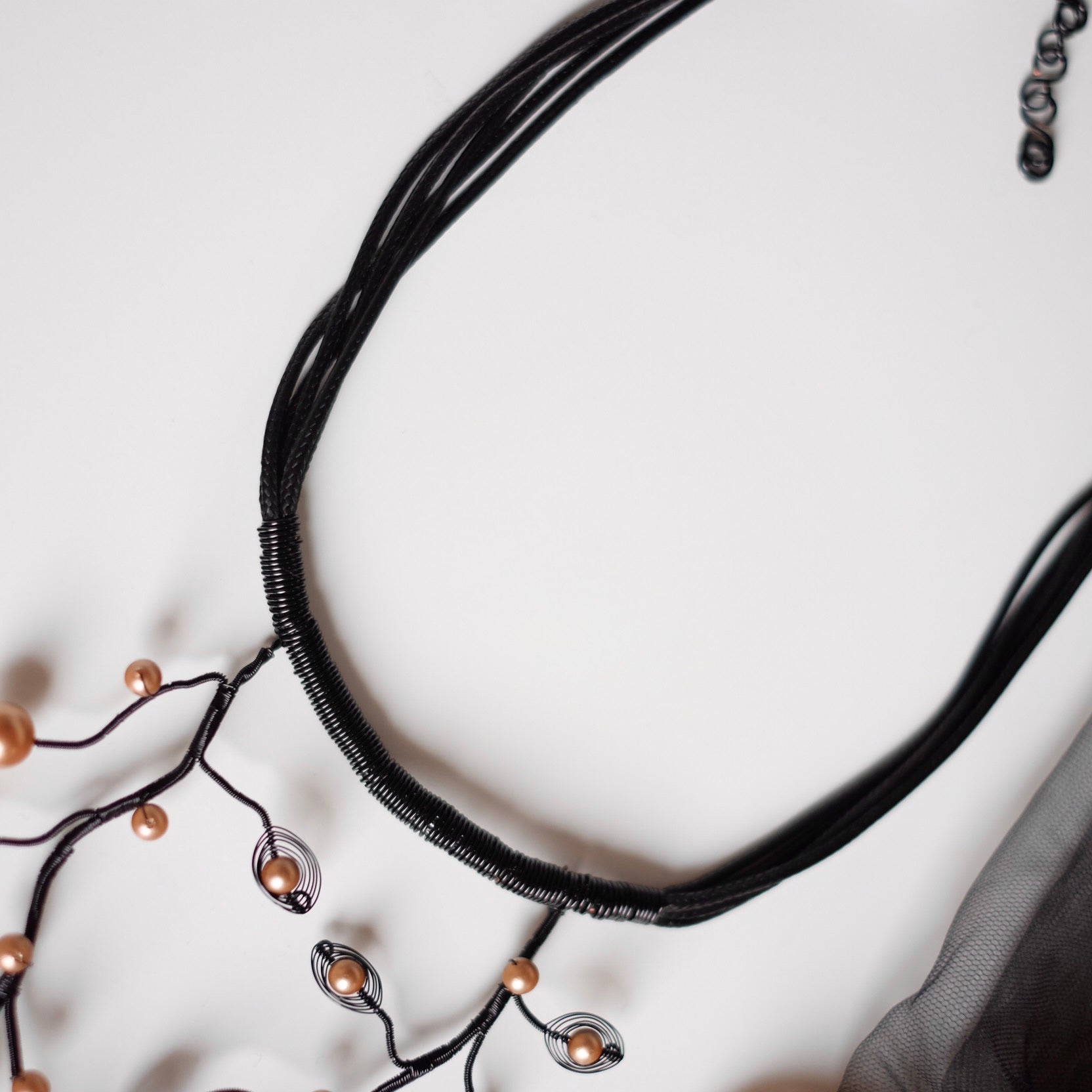 It's made of enameled copper wire in black and shell pearls.