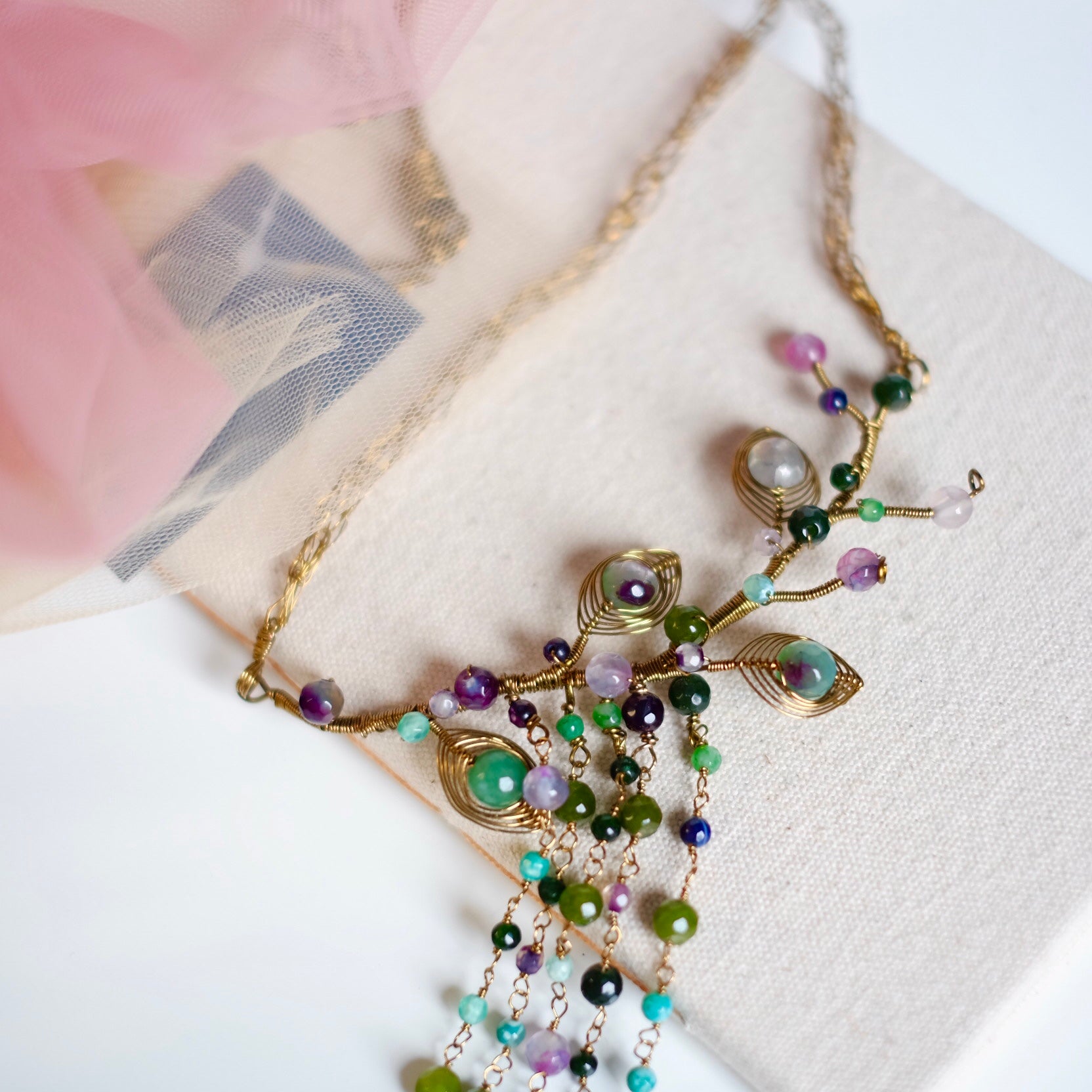 It's made of enameled copper wire in vintage bronze and mixed color agate stones.